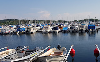 Men inte nere på bryggan. Där får vi som är på auersk syskonträff vara ensamma om solen, värmen, glädjen och vattnet. Nja, inte riktigt. Det finns ju ganska gott om fritidsbåtar, förstås.