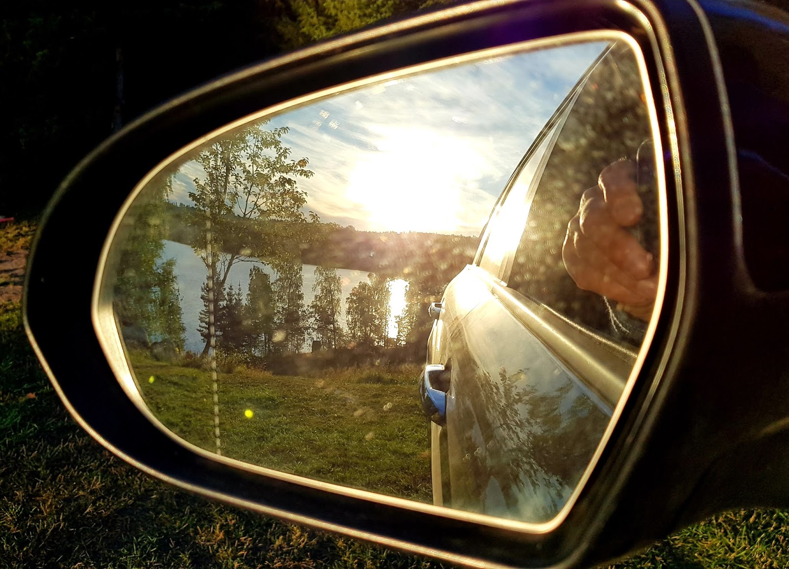 På vägen till Kisa får jag för mig att jag ska borsta bakrutan ren från allt damm och grus som fastnat där. Så jag stannar på rakan före Yxefall och borstar och när jag ändå håller på kan jag väl se om hela bilen behöver lite putsning, tänker jag.